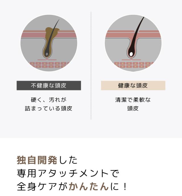 - アタッチメントを交換すれば、頭だけでなく、ボディケアにも使えるのでお風呂上がりに重宝しています。