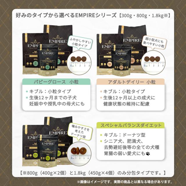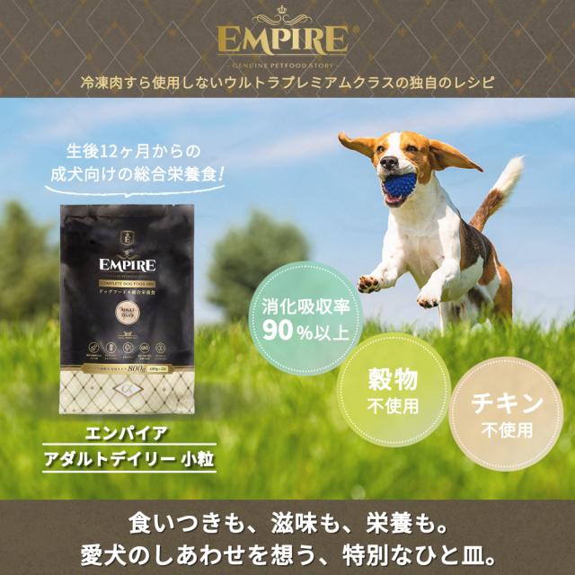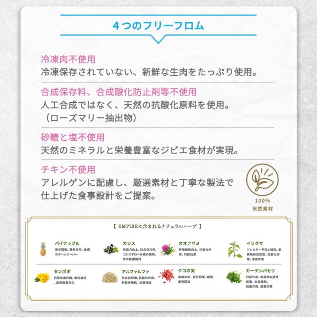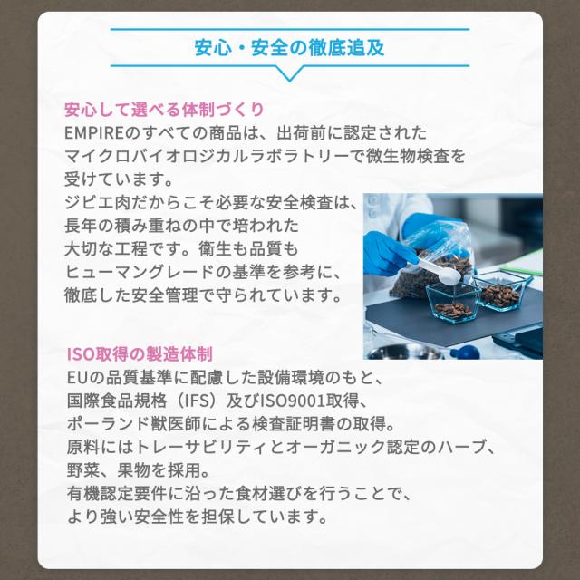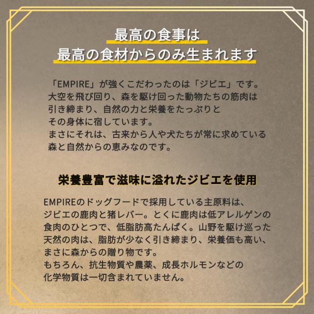 | 商品説明 | ポーランドの豊かな自然からの贈り物。愛犬のためのナチュラル・ジビエフード。 豊かな森と大空を駆け回った動物たちの筋肉は引き締まり、自然の力と栄養をたっぷりとその身体に宿しています。 エンパイアは、ポーランドの大自然が産んだ新鮮なジビエを丁寧に調理し、愛犬の食卓にお届けします。 79.5%もの肉原料を使用した健康的で低アレルギー、チキンフリー、グレインフリー、グルテンフリーの食事です。新鮮な鹿肉や猪のハート&レバーを多く採用し、素晴らしい嗜好性を実現。 冷凍肉すら使用しないウルトラプレミアムクラスの独自のレシピで、生後12ヶ月以上の成犬たちの健康状態と生活の質を最高レベルに維持する為に役立ちます。 生後12ヶ月からの成犬には、毎日の食事にEMPIRE ADULT DAILY DIETを与えることをお勧めします。与えやすい小粒サイズです。 冷凍肉は一切使用しておりません。乾燥肉は生正肉を自社乾燥させています。 すべての食材はポーランドで生産されています。 特長 ◎4つのスタンダード 100%NATURAL、ヒューマングレード、グレインフリー、セイフクオリティ ◎4つの約束 冷凍肉不使用、合成酸化防止剤不使用、砂糖・塩不使用、鶏肉不使用 ◎新鮮-フレッシュ- 乾燥肉は生正肉を自社乾燥。 ◎α-detoks α-detoksとは、健康と免疫力の維持の為に、ハーブの特性を最大限に活かした独自配合レシピです。 |