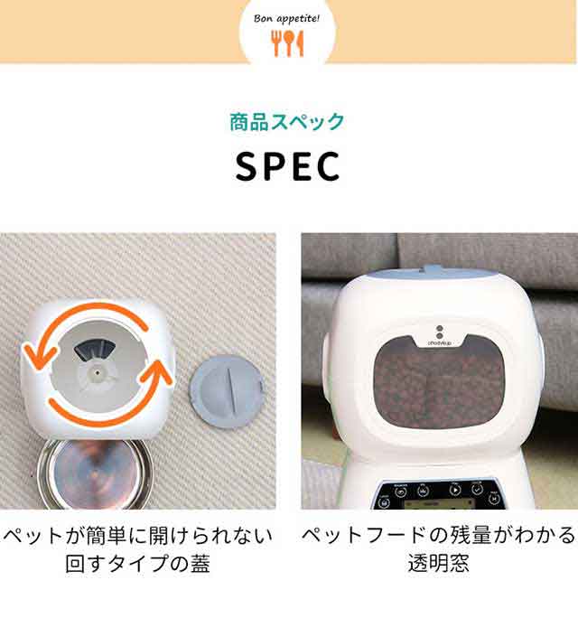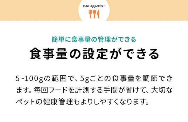 | 特記事項: 本製品はドライフードのみご使用できます。 ※給餌量は目安です。フードの形状や大きさにより量は変わりますので、個体に合った量を確かめてから給餌量を設定してご使用ください。 |