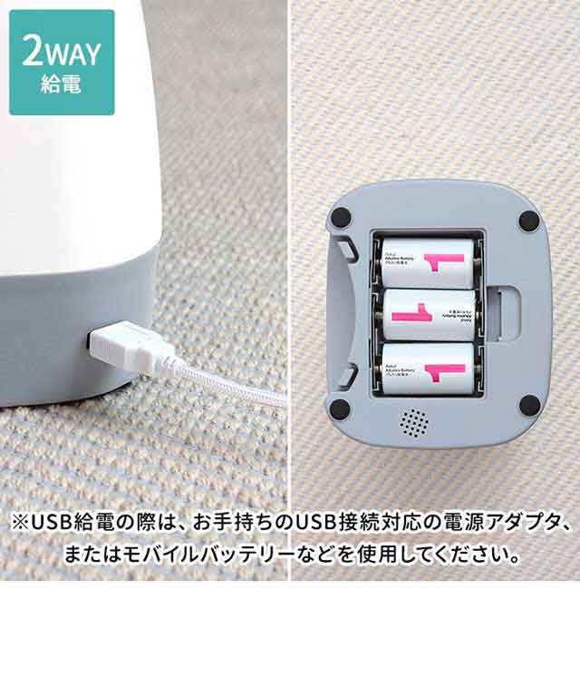| 電源: 単一アルカリ乾電池×3本(別売) / DC5V 1A USB給電 |