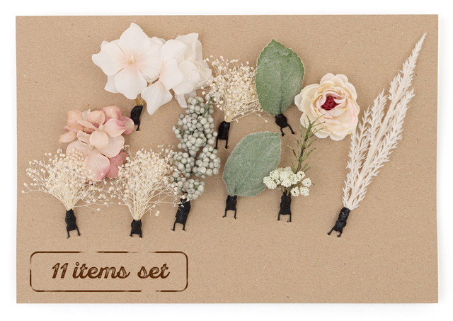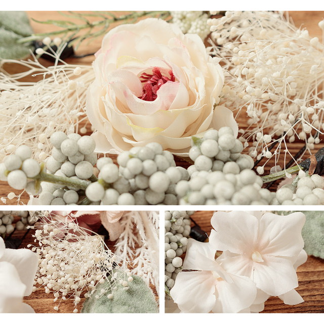 くすみカラーの質感が麗しい植物の数々にドライフラワーのような小花が、ワントーンコーデにぴったりな落ち着いた雰囲気です。