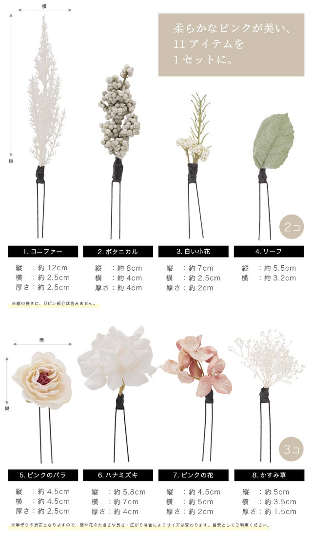 和装のヘアスタイルを彩る、花の髪飾り11点の小花セットです。