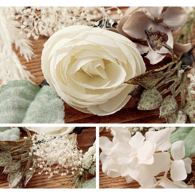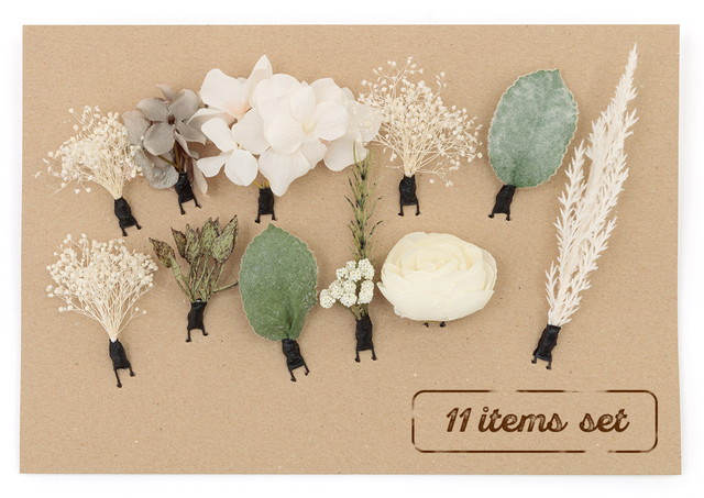 くすみカラーの質感が麗しい植物の数々にドライフラワーのような小花が、ワントーンコーデにぴったりな落ち着いた雰囲気です。