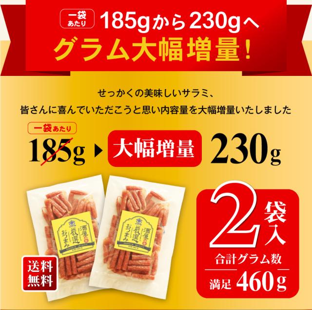 - メッチャリピートしてます。 ホンマ美味しいサラミなので買ってましたが… 今回から増量された分、個包装ではなくなったのですね。 残念です。商品自体はしっとりしていて美味しいですが、袋にバラバラの状態で入...
