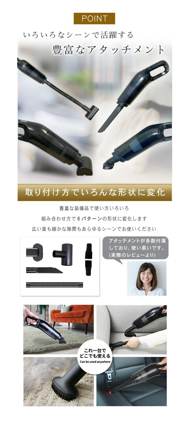 手にも吸い付く吸引力で車内の砂利なども軽々と吸引。