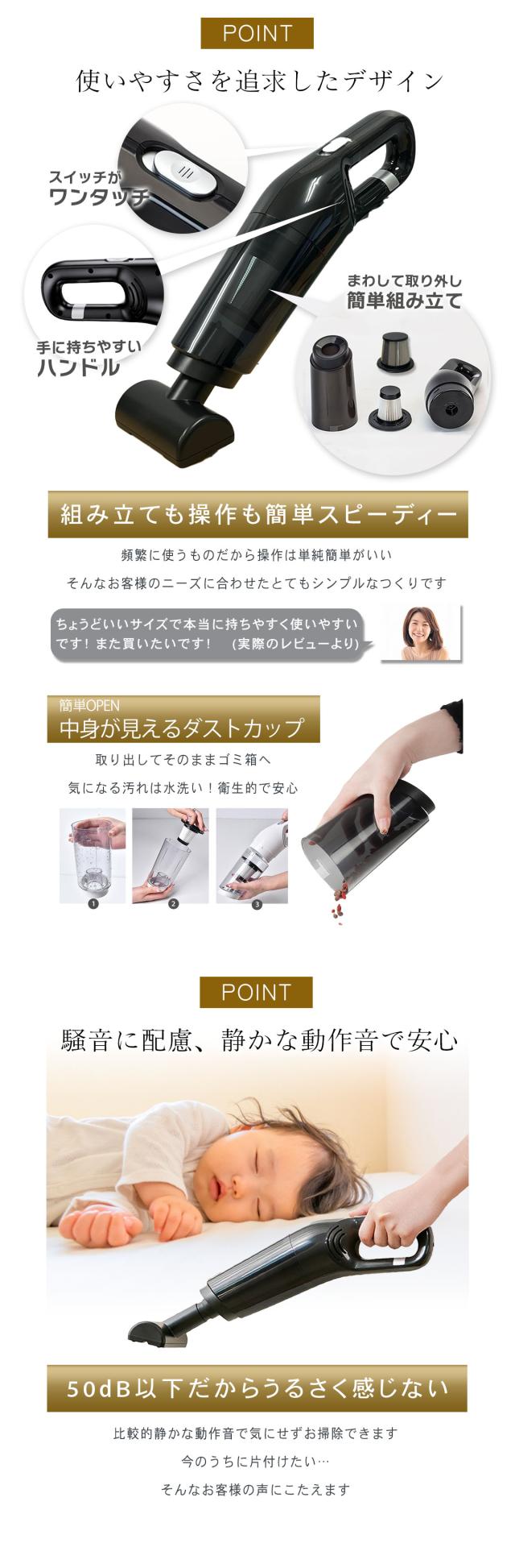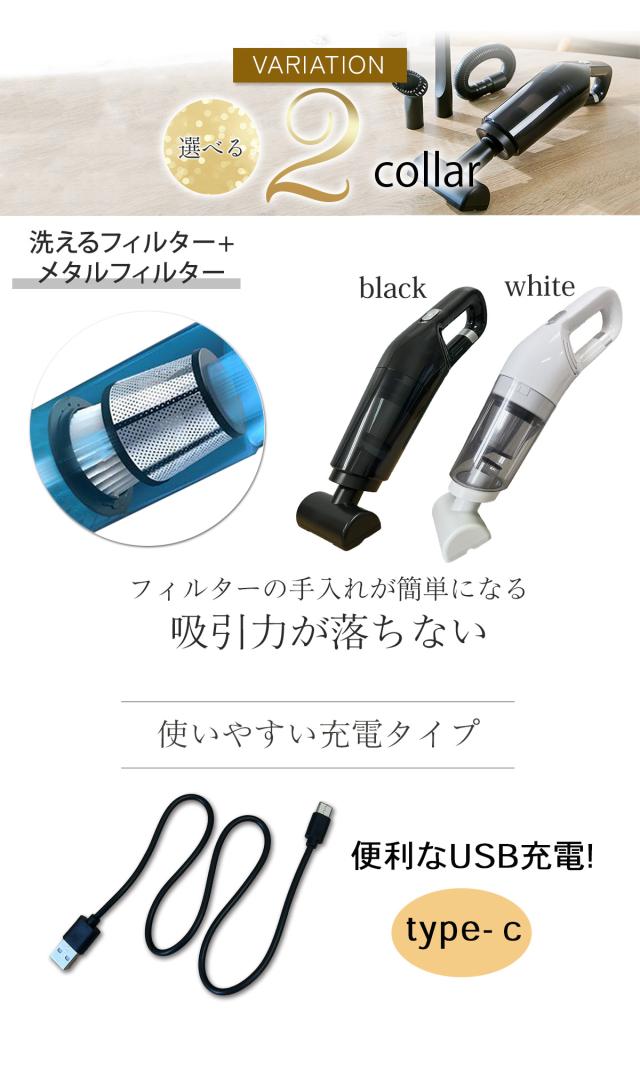 - 注文から2日で届きました。音もさほど気にならず、吸引力もあり、軽いし!机の周り洗面台周りにと購入しました。車にも置こうと2個購入しました。