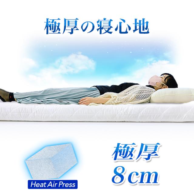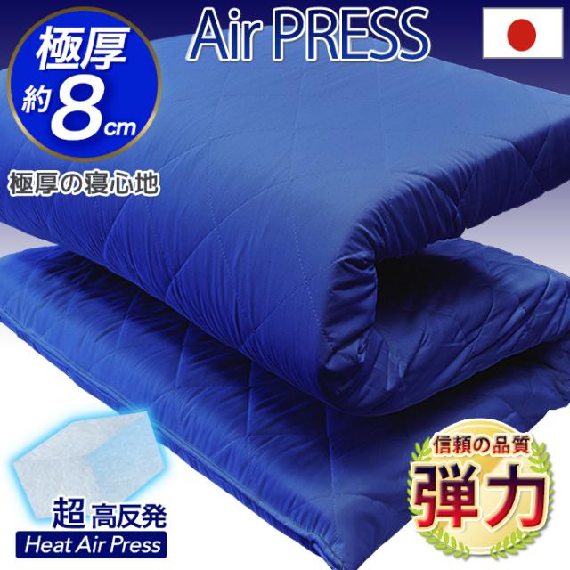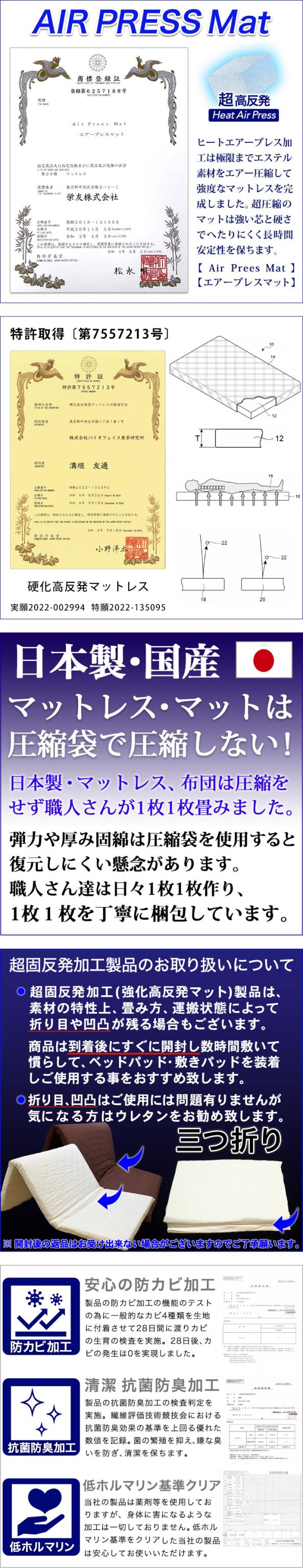 重厚タイプ!マットレス ◆ ベッド・フロアリング・畳みにそのまま置いて! 【エアープレスマット】Air Press Mat 3層構造 高反発 固反発 固め 硬め 弾力 快眠 安眠 マット マットレス 安定性 寝返り上手 オーバーレイマットレス ヒートエアープレス加工:硬めマット ◆ヒートエアープレス加工は極限までエステル素材をエアー圧縮して強度なマットレスを完成しました。 超圧縮のマットは強い芯と硬さでへたりにくく長時間安定性を保ちます。 【Clean Keep 清潔さ長持ち】 ダブルクロス加工をしハウスダスト対策しております。また内生地には防ダニ加工、外生地には抗菌・防臭・防カビ加工をし安心で清潔な衛生加工を施してます。 ◆日本国内工場にて一枚一枚手作りして発送しております。 日本製 工場から直送しています。 ◆プリントは抗菌防臭加工はありません。御了承願います。ダイヤキルトはシングルキルト・ダブルキルト混ざる場合がありますがご使用には問題ございませんのでご了承願います。マットレスは定期的な天干し加工をお勧め致します。 ◆超固反発加工製品のお取り扱いについて ※超固反発加工(強化高反発マット)製品は、素材の特性上、畳み方・運搬状態によって折り目や凹凸が残る場合も御座います。※商品到着後にすぐに開封し、数時間敷いて慣らしてからベッドパット・敷きパッドを装着しご使用する事をおすすめ致します。※折り目、凹凸はご使用には問題有りませんが気になる方はウレタンをお勧め致します。また本品AirPressは厚さが約8cmですが超固反発加工による生産工程や運送途中で圧縮されたり畳む際に生じる折り目等により約6〜7cmになる場合や多少のサイズが異なる事が御座いますのでご了承願います。 ※厚さは計測箇所により異なります。ご了承願います。 |