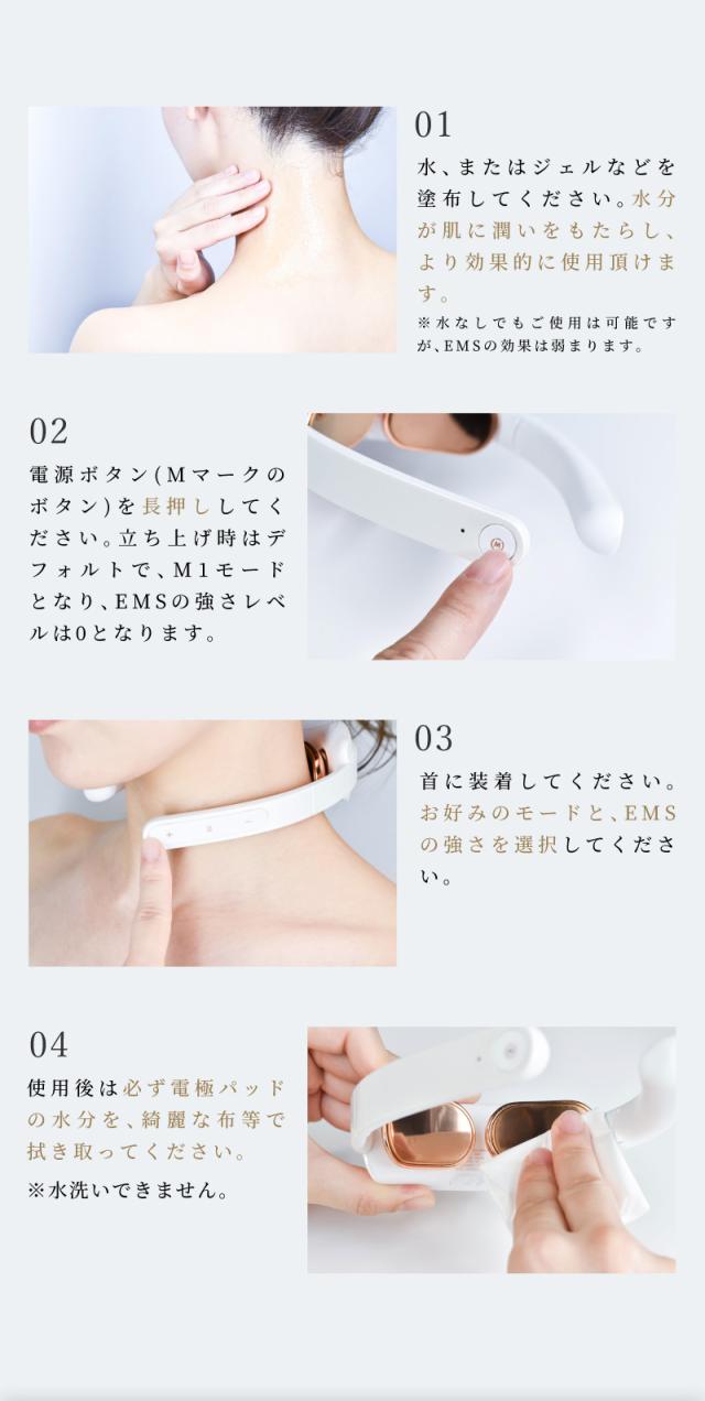 ・医師に運動やEMS機器の使用を禁じられている方、お肌が敏感な方、お肌に疾患がある方、アレルギー体質の方、インプラント治療をしている方、乳幼児や小さなお子さま、薬(抗凝固剤等、血液が固まりにくくなる成分を含んだ薬)を服用中の方、飲酒後や疲労の激しい方、妊娠中の方は使用しないでください。