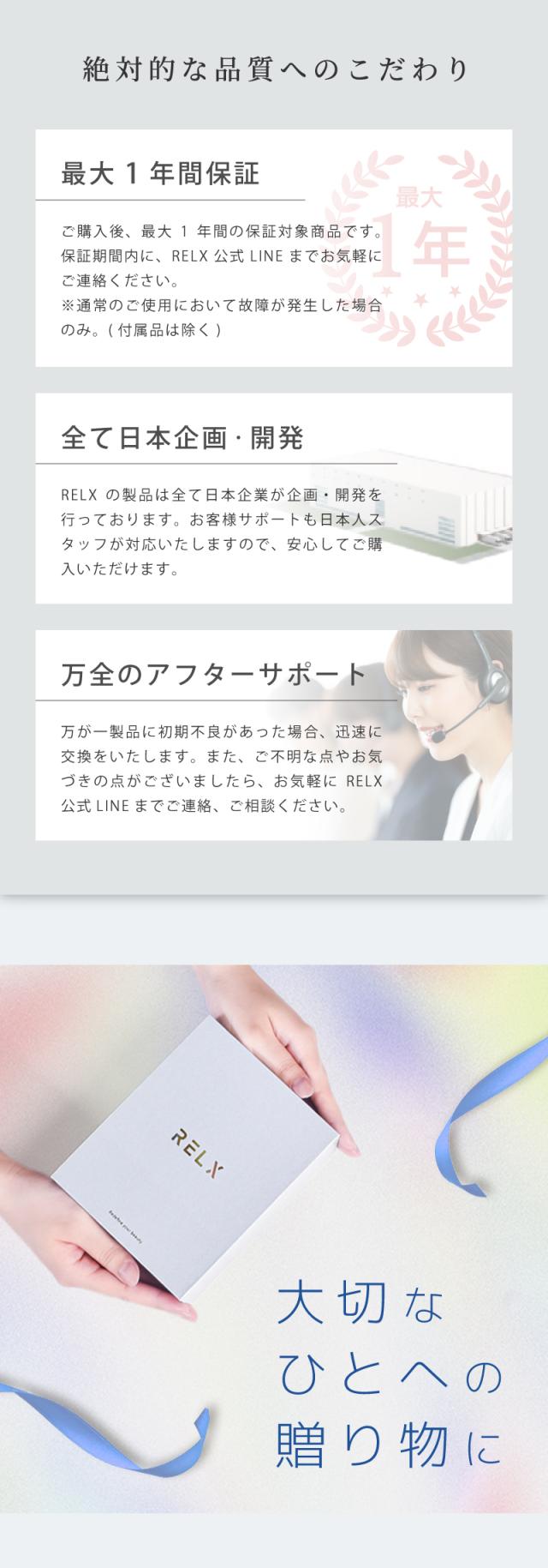 独自の低周波パルス「EMS」が首や肩にアプローチ。その日の疲れに合わせて15段階の強弱レベルが選択可能。さらに温熱テクノロジーの搭載で30秒以内で徐々に快適な温度へ、RELX(リラクス) ネックウォーマーは至極のリラクゼーションをお届けします。