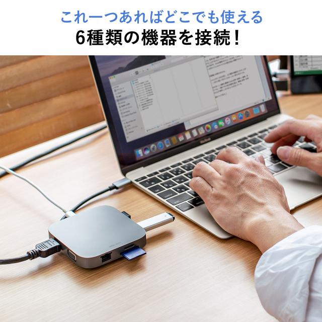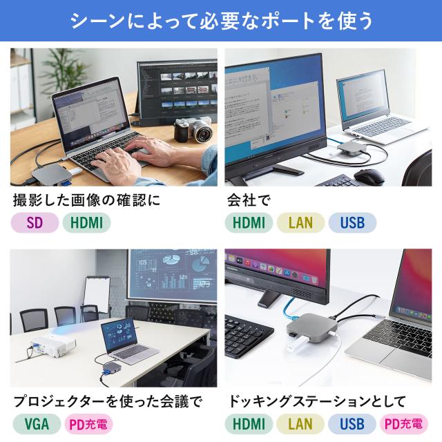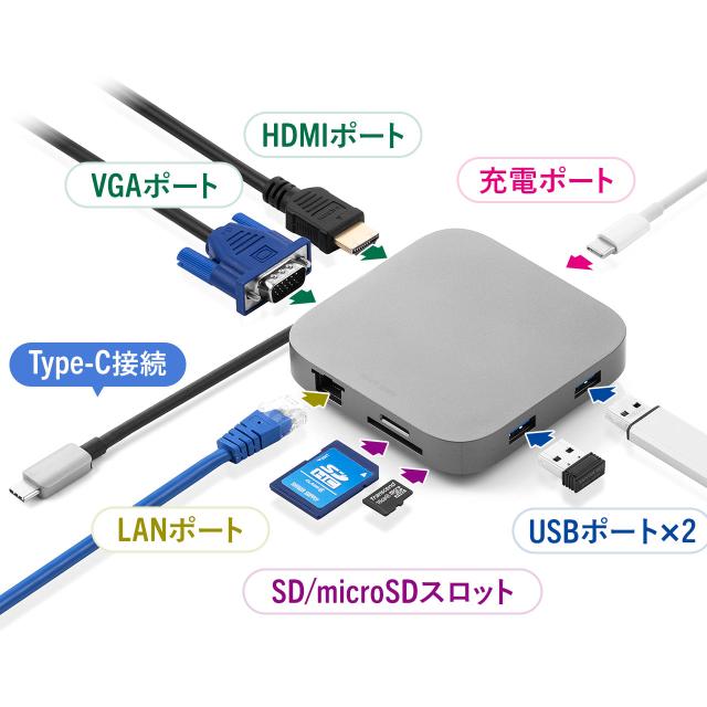 モバイルドッキングステーション USB Type-C接続 USB PD100W対応 8in1 HDMI VGA SD/microSDカードリーダー LAN端子[400-HUB091S]