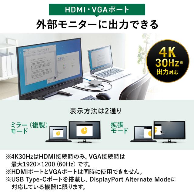 ■対応解像度:HDMI/最大3840×2160(4K/30Hz)、VGA/最大1920×1200(60Hz)