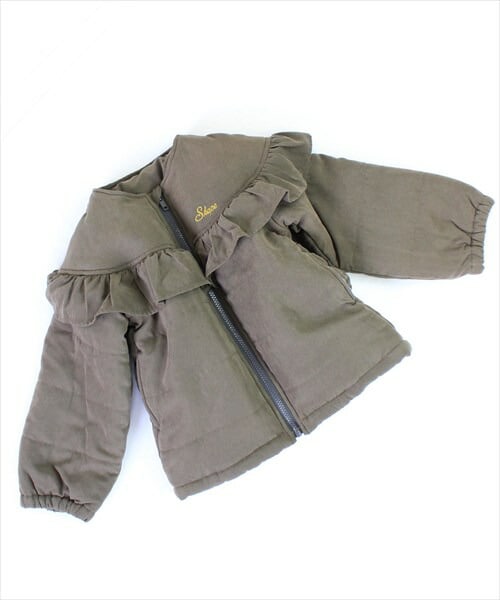 肩を落とした形がレディライクなジャケットです。大きなフリルがガーリーです。ファスナー開きで着脱もらくらく。防寒に適した防風加工を施した中綿素材です。サイズはベビーサイズからキッズサイズまで取り揃えております。ブラウンとチャコールの2色展開です。新作秋冬物の商品です。