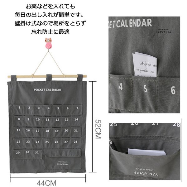 カレンダーポケット ウォールポケット 1ヶ月 壁掛け式 収納ポケット お薬カレンダー 小物収納 吊り下げ グレー 投薬カレンダー 薬ポケット 薬入れ KAREN