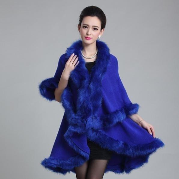 長いウールカシミヤフェイクキツネの毛皮コートポンチョ_Blue_購入時サイズ選択(ワンサイズ)