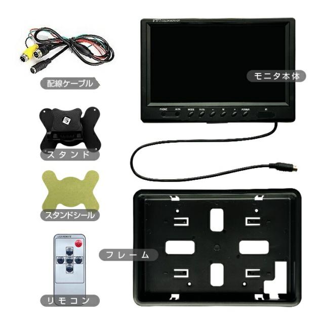 セット内容:モニタ本体、モニター用配線、バックカメラ、フレーム、4PINタイプ20m配線ケーブル、スタンド、スタンド用粘着シール、リモコン