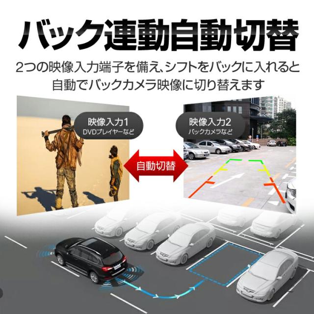 2つの映像入力に対応し、バック操作で自動にバックカメラ映像に切り替えます