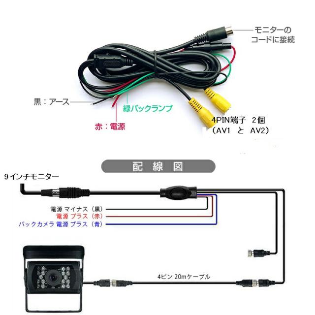 9インチモニター+バックカメラ+20mケーブル 3点セット 4pinタイプ 電源1箇所に纏める 24V/12V対応 映像2系統入力 OMT90NEWSETPRO