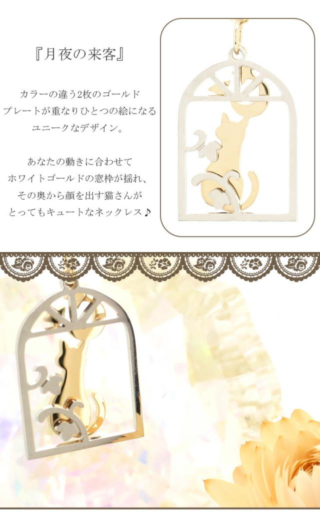 K10 YG WG 月夜の来客 猫シルエット スライドプレート ネックレス 10金 10k k10 ホワイト イエロー ゴールド レディース 女性用 ねこ