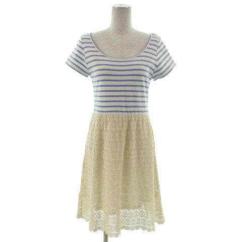 【中古】ラボラトリーワーク ワンピース クロシェ編み切替え 半袖 ひざ丈 ボーダー アイボリー 青系 ベージュ M