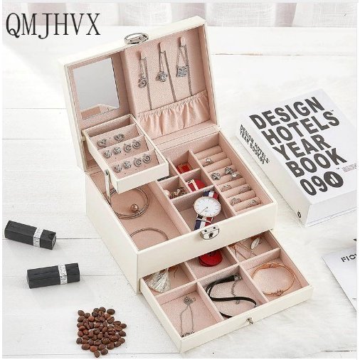 7-420 QMJHVX 自動レザージュエリーボックス 三層 収納ボックス用 女性 イヤリングリング 化粧品 オーガナイザー棺用 装飾