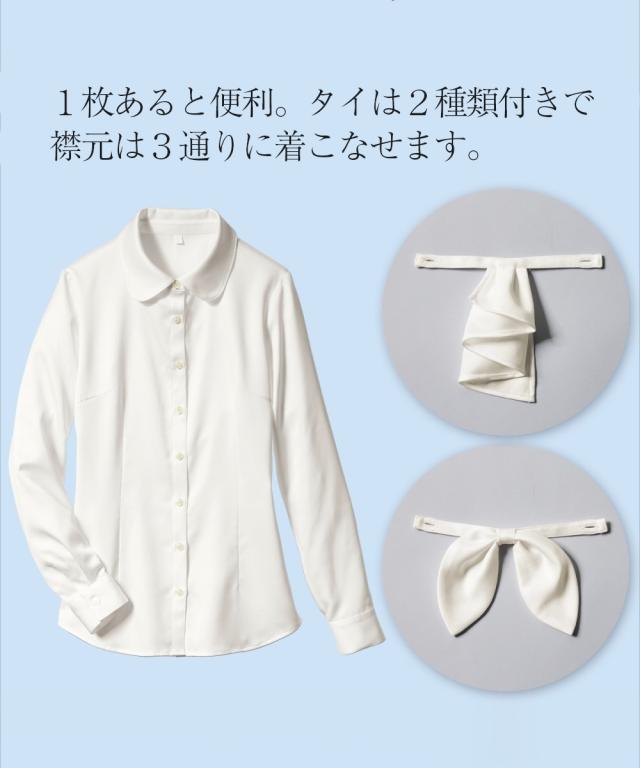 [keyword] レディースファッション 大きいサイズ レディース 標準サイズ 普通サイズ ゆったりサイズ プラスサイズ 長袖 おしゃれ 洗濯機洗いOK 洗濯 抗菌防臭 無地 無地調 柄 かわいい オールシーズン 通年用 春 夏 秋 冬 年中 一年間 [comment] ☆制服スタイルの女子力を後押しする、フリルタイとリボンタイが付いたシャツ☆・上品な光沢があり、肌触りもよいパウダーサテン素材のシャツ。・女性らしい丸みのある衿に2種類のタイを付け替えできるデザイン。・リボンタイ・フリルタイが胸元を華やか