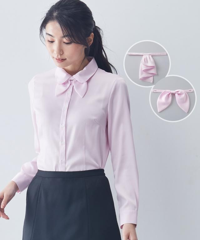 【事務服】パウダーサテンシャツ(抗菌防臭加工)(リボンタイ・フリルタイ付)