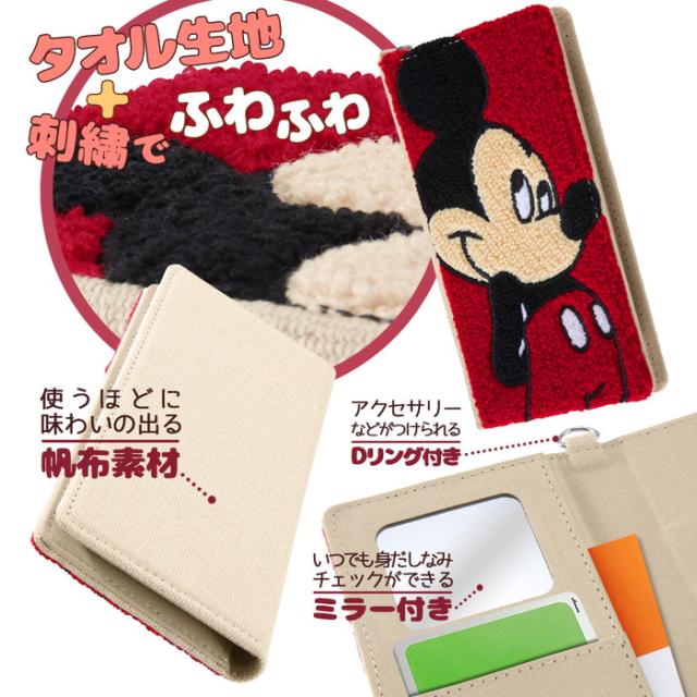 iPhone13mini 5.4inch ケース 手帳型 ディズニー キャラクター サガラ刺繍 ミッキー ミニー チップ&デール プーさん パイル タオル ストラップ iPhone 13 mini