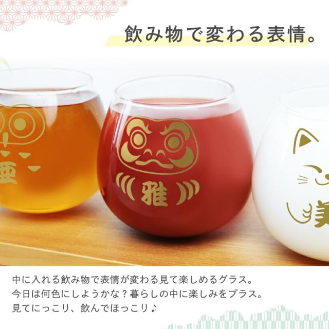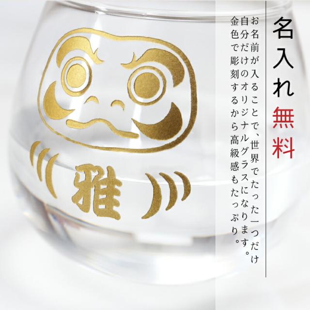 ゆらゆら揺れる、ゆる〜い姿。 だけど絶対倒れない! 癒されるけれど頼もしい。 そんな縁起物たちがあなたに幸運を運びます。 1.倒れても起き上がるグラス まん丸な形状をしたこちらのグラスは起き上がりこぼし構造。 自力でバランスをとるから絶対に倒れません。 傾いたときもすぐに自分で起き上がるので、 中身が全部こぼれることはなく、汚れも最小限におさえます。 転ばない!めげない!くじけない! たくましくて粘り強い姿は達磨(だるま)そのもの。 まあるいフォルムが手に気持ちよくフィットして、使い心地も抜群。 机の上でゆらゆらと揺れる姿には愛嬌があって、ホッと癒されます。 貴方の暮らしにそっと寄り添い、見守ってくれるような 頼もしくて安心感のあるグラスです。 2. 福がくる縁起物デザイン いずれも縁起物がモチーフになっているデザイン。 使えばこんなご利益が!? 3種類の中からお選びください 【 縁起の良い 3種のデザイン 】 - だるま - 「 家内安全 」・「 開運吉祥 」 七転び八起き、不屈の精神。 そんな諦めない心を持つダルマは、あなたの願い事や目標を叶える助けをしてくれます。 受験生応援グッズ としても人気のあるモチーフです。 - ふくろう - 「 学業成就 」・「 招福招来 」 森の賢者、学問の神様と呼ばれている知識のシンボルである梟。 “不苦労”、“福来朗”という語呂合わせがあることから、 福をよびよせ、苦労を退ける幸運の鳥としても親しまれています。 - まねきねこ - 「 金運上昇 」・「 商売繁盛 」 手招きポーズが可愛いだけではなく、幸せまでひき寄せてくれる 猫グッズ。 人を招き、お金を招く まねき猫 は、開店祝い や 開業祝い の贈り物として人気です。 飲み物の色によって表情が変わります。 お茶、コーヒー、ジュース、ビールやワインなど、 いろんな飲み物で、楽しんでみてください。 見てにっこり、飲んでほっこり♪ 笑顔を運んでくれる縁起物グラスは、普段使いにはもちろん、 お祝い や、記念日 などの贈り物にもおすすめ。 男性 女性 年齢問わず、どんな方にも喜んでいただけます。 3. 無料彫刻サービス デザインの中心には、お名前の文字を一文字彫刻いたします。 お名前が入ることで、世界でたった一つだけ!自分だけのオリジナルグラスになります。 金色で彫刻するから高級感もたっぷり。 「自分の為に選んでくれたんだ」 そんな思いが伝わるから 名入れグラス は贈り物にぴったり。 贈った側も受けとった側も嬉しい気持ちにしてくれます。 私たちはみんなが笑顔になるギフトをお届けします。 ≪こんなシーンにおすすめ≫ ・おじいちゃん、おばあちゃん へ 敬老の日 ギフトとして ・還暦 古希 喜寿 米寿 など、長寿のお祝いとして ・受験生や資格試験を受ける方へ 合格祈願 のお守りとして ・引っ越し祝い 開店祝い 開業祝い に ・猫好き ふくろう好きの方への プレゼントに |