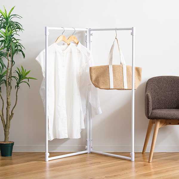 お部屋のコーナーにフィットする2面のL字型設計です。ぱっと広げるだけですぐに使えて、省スペースに洗濯物を干すことができます。
