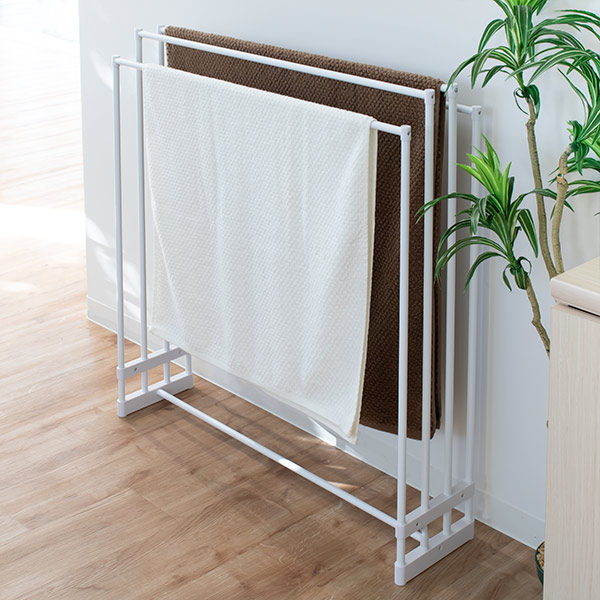 清潔感のあるマットなホワイトカラーがスタイリッシュなバスタオルスタンドです。すっきりと洗練されたデザインは、どんなお部屋でも美しく空間に溶け込みます。タオルを干すだけでなく、少量の洗濯物の部屋干しにもお使いいただけます。