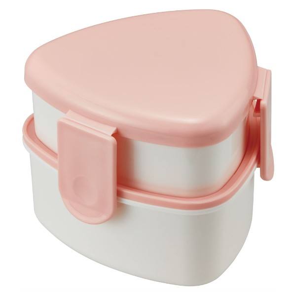 小さな三角型のシンプルな2段お弁当箱です。コンビニの三角おにぎり1個が袋のまま入るサイズで、容量は上段が230ml、下段が270mlの総容量500mlです。上段、下段共にご飯がくっつかない加工が施されています。