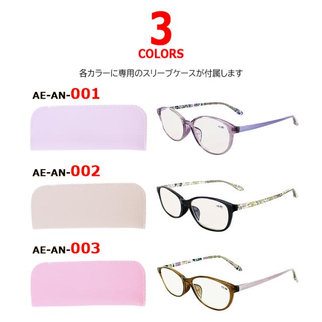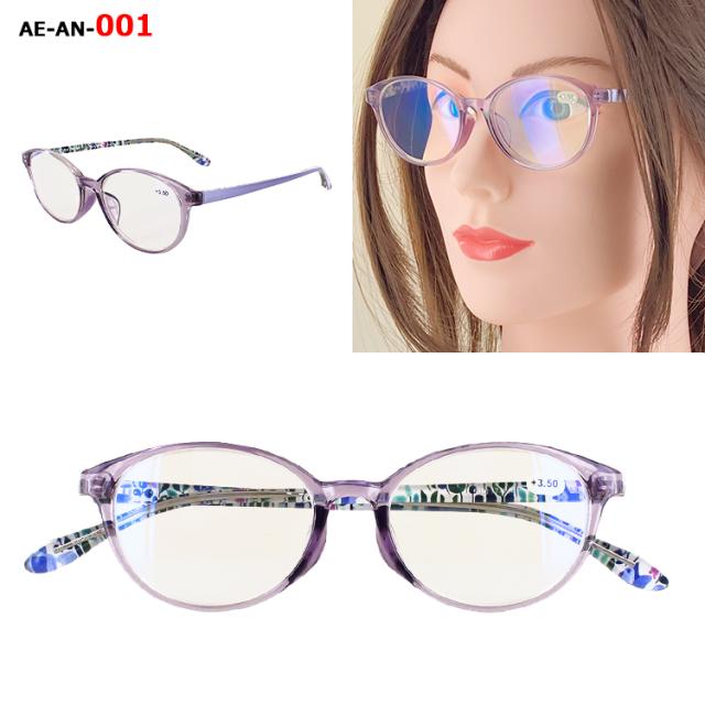 | ●フレームカラー AE-AN-001パープル系(ボストン型) AE-AN-002ネイビー系(スクエア型) AE-AN-003ブラウン系(オーバル型) ●レンズカラー クリア(ブルーライトカット・ARコート) | ●素材 フロント(枠):ポリカーボネート テンプル:TR90 レンズ:アクリル・ARコート ●仕様 ブルーライトカット約27% UVカット99% ARコート(反射・映り込み防止) |