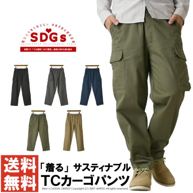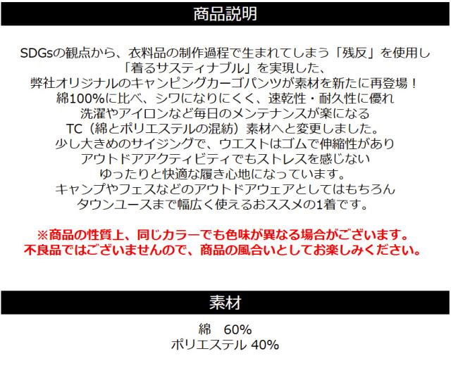 TC素材 着るサステナブル 残反 キャンピングカーゴパンツ メンズ キャンプウェア アウトドア オーバーパンツ ゆったり ウエストゴム 【EP-02-5】送料無料 通販A3