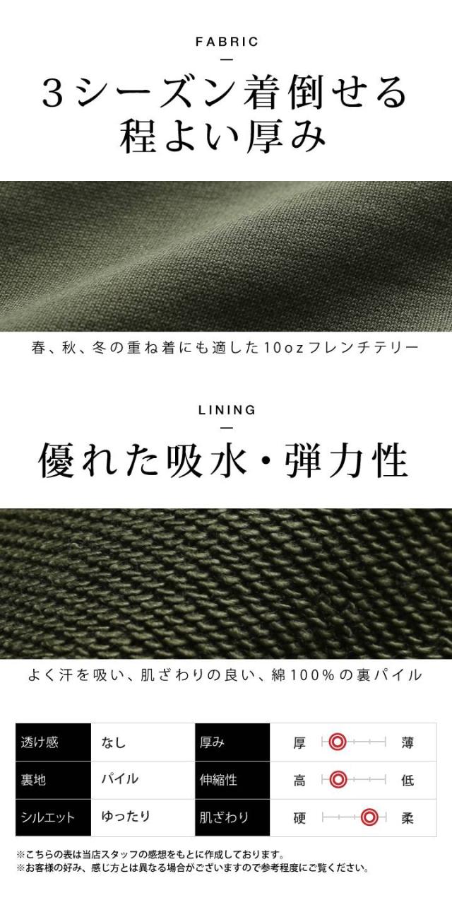 ソフトな肌当たりが実感できる裏パイルスウェット生地。