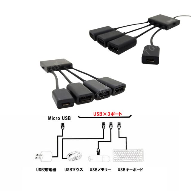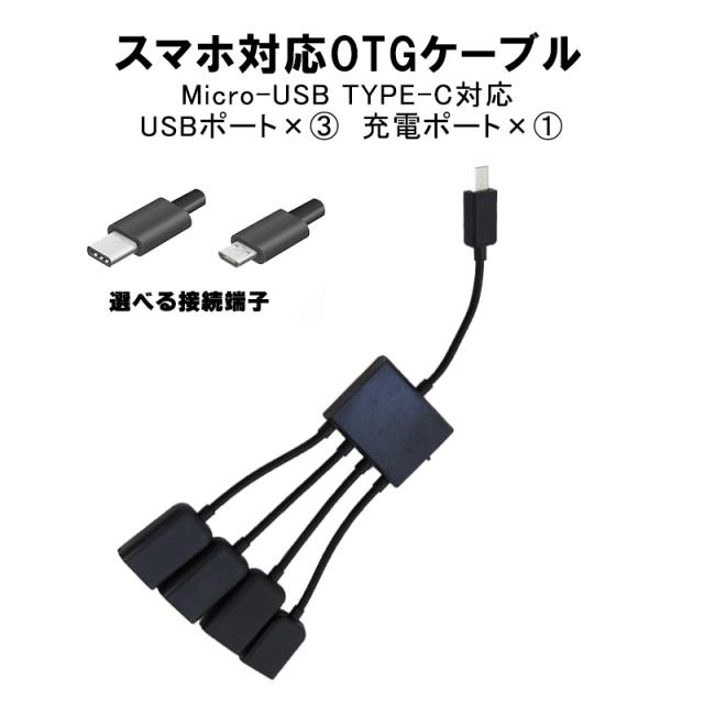 OTGハブケーブル 給電 USB3ポート MicroUSB TYPE-C ブラック 【送料無料】
