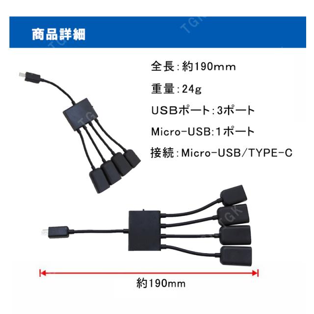| ・対応機種:OTG対応Androidスマートフォン、タブレット ・サイズ:約L190(mm) ・重さ:約24(g) ・ポート:USBポート×3 MicroUSBメス:1ポート(USB機器給電用) |