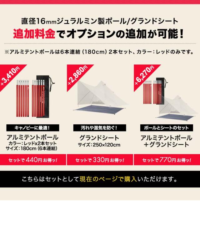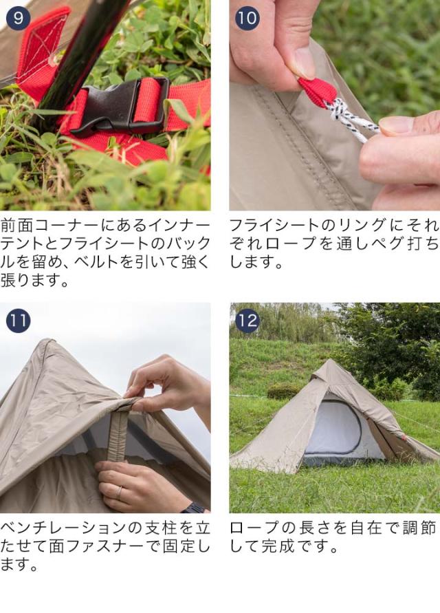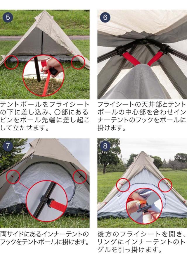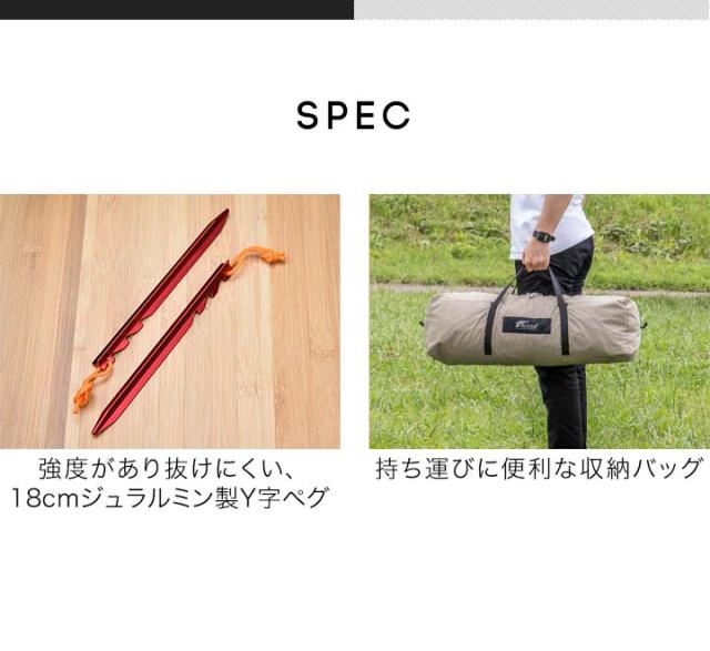 | 付属品: ・テント本体×1 ・フライシート×1 ・テントポール×1 ・ペグ×10 ・ロープ×4 ・専用キャリーバッグ×1 ・取扱説明書(日本語) |