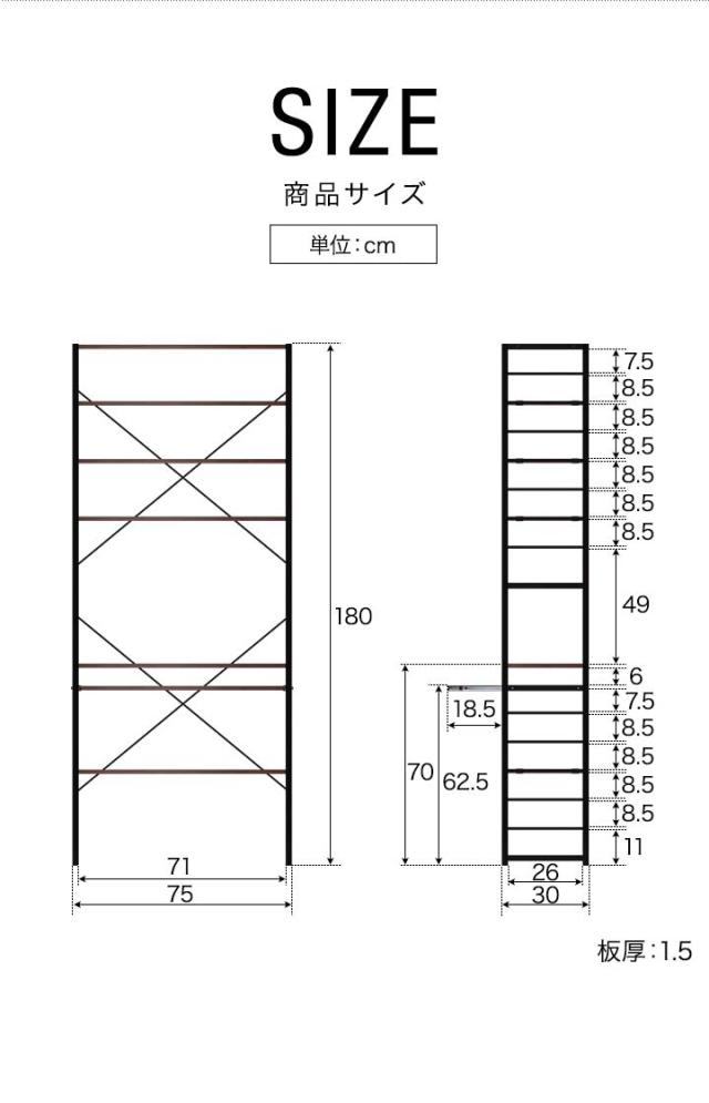 | サイズ: (約)幅76cm×奥行31cm×高さ180cm ※ボルト・筋交い含む最大サイズ |