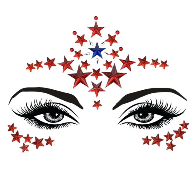 星型スターの赤色レッドと青色ブラック、涙型の透明クリアのビジューをティアラのようにデザインしたキラキラのグリッタージェムフェイスシール。