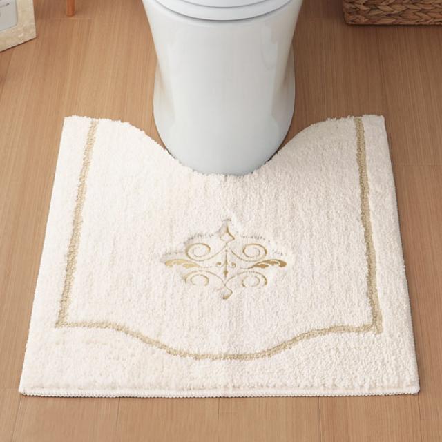 毛足の長いカットパイル仕上げで、フワフワもこもこの触り心地。ホワイトにゴールドの刺繍が、高級感を演出するトイレマットと洗浄暖房用フタカバーのセットです。
