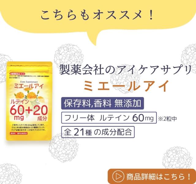 | 原材料名 | ブドウ糖、ブルーベリー果汁末、ルテイン含有マリーゴールド抽出物、ビルベリーエキス、メグスリの木、カシスエキス、アイブライトエキス末、ブドウ種子エキス、クエン酸、ステアリン酸カルシウム、β-カロテン |