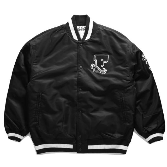 左胸と袖・後身にカレッジテイストの「ロゴワッペン」をレイアウトした、スポーツ・ストリートMIXの中綿入りスタジアムジャケット。