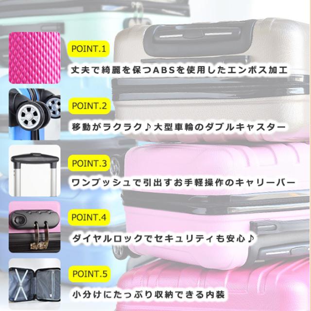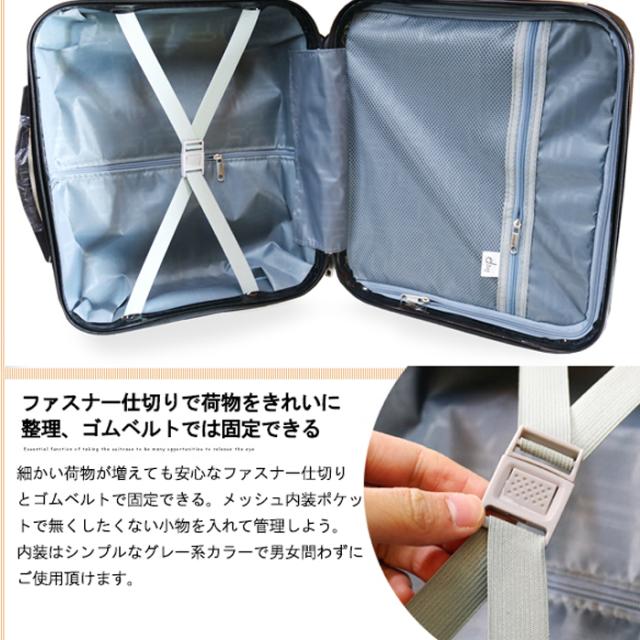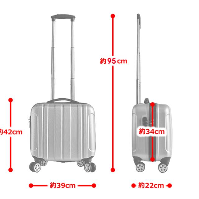 コンパクトなデザインで、国内旅行や短期の出張、バスツアーや遠征など適度な荷物で済ましたいちょっとした旅に便利なこちらスーツケース。 かさばらない正方形サイズで人混みや電車内でも快適に移動ができ、荷物の置き場に困るバス内でも気軽にお持込していただけます。 また、男性の方や女性の方にもおすすめできるように、カラフルなお色から、落ち着いた色と全16色を取り揃えております。 軽量で丈夫なABSを素材に使用しており、しなやかで弾力があり丈夫な仕上がりとなっております。 傷や汚れが目立ちにくいエンボス加工でいつまでも綺麗な見た目を保ちます。 丈夫で、傷や汚れに強い事で気軽にお持ちいただけます。 本体を倒さずに移動でき、綺麗にまとめた荷物の片寄りも軽減する水平移 動が可能となっており、移動もスムーズに行えて女性の方にもおすすめと なっております。 また、車輪も直径5.5cmあり大きめ車輪を採用する事でより安定感のある仕上がりとなっております。 ワンプッシュで引き出せる簡単操作ですので、なにかと荷物の多くなる旅行の際も手間が掛からず、サッと引き出す事ができる大変便利な機能となっております。 ファスナー部分のロックには3桁のダイヤルロックを採用。 飛行機やホテ ルなど目を離さないといけなくなる事も多いスーツケースですが、こちら のスーツケースはセキュリティ面にもしっかりと配慮しております。 仕切りがあり上下での収納が可能。 すぐに使う物やよく使う物の収納に便利なメッシュポケット付きで、中身の確認もすぐにでき、サッと取り出していただけます。 また、従来のファスナーを使った仕切りではなく、カチっと止めるスイッチ式のベルトを仕切りに使用しており、たっぷりと入れていただけます。 全体サイズ約W39×H42×D22cm ケースサイズ約W39×H34×D22cm 重量約2.2kg 素材ABS 容量約29リットル キャリーバー地上から最長約95cm |