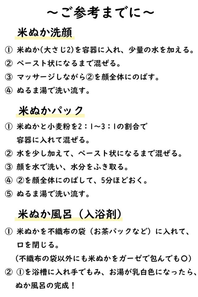 (3) ご利用方法は、お漬物の「ぬか床」は勿論ですが、フライパンで「煎りぬか」にして料理に使用すると普段の料理が健康食に生まれ変わります。是非お試しください。