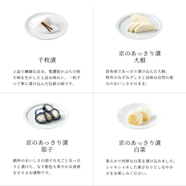 | 千枚漬70g×2、京のあっさり漬(大根1/4割、茄子1個、白菜223g)、赤かぶら80g、赤しそむらさきの50g、味すぐき40g、山里の香り40g、ゆずの香り50g ※原料事情により、詰合せ内容が変わることがあります。 |