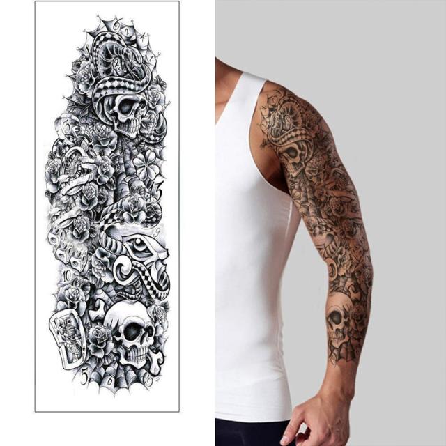 ロングフェイクタトゥーステッカー 1シート スカル ガイコツ ドクロ 髑髏 がい骨 骸骨 白黒 花 薔薇 時計 バラ ローズ 蛇 スネイク スネーク トランプ サイコロ ダイス タトゥシール メンズ レディース 仮装 入れ墨 衣装 コスプレ 胸 肩 背中 お腹 太腿 足首 腰 太もも 刺青