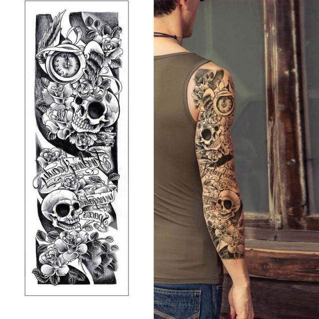 長いロングタイプの腕から手首までや太ももから膝下までにぴったりの白黒の髑髏(どくろ)や薔薇(バラ)の花ローズフラワー、時計、ウイング翼、羽根をモチーフにした水で貼るフェイクタトゥ—ステッカー。