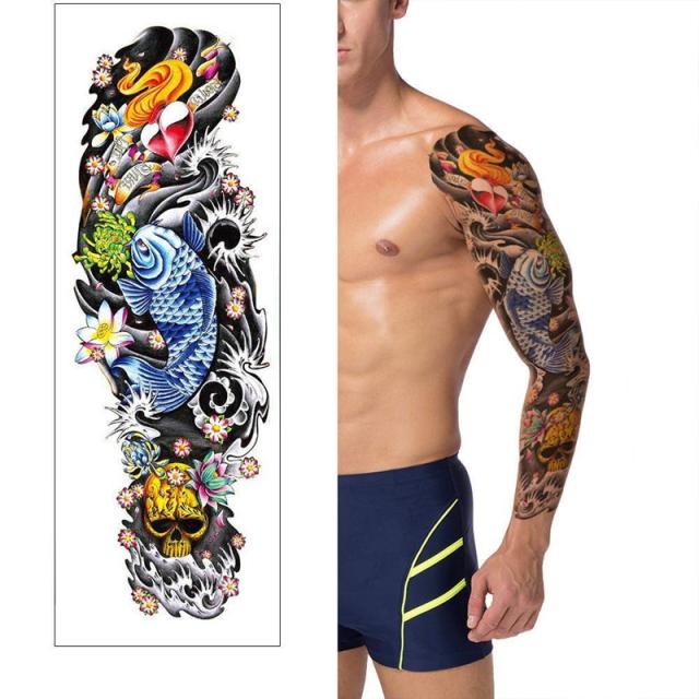 長いロングタイプの腕から手首までや太ももから膝下までにぴったりの金色ゴールドの髑髏(ドクロ)や蓮の花や滝を上る青色ブルーの鯉をモチーフにした水で貼るフェイクタトゥ—ステッカー。