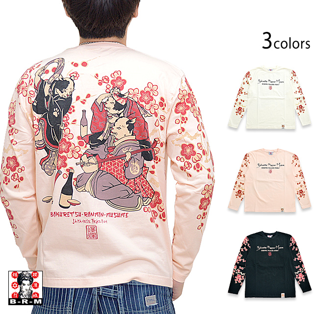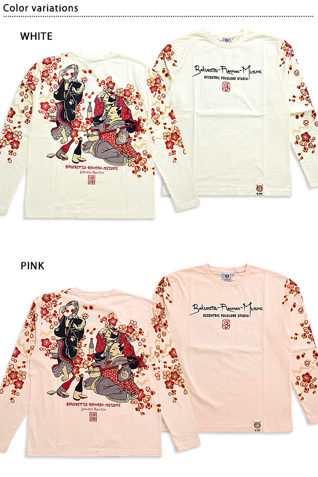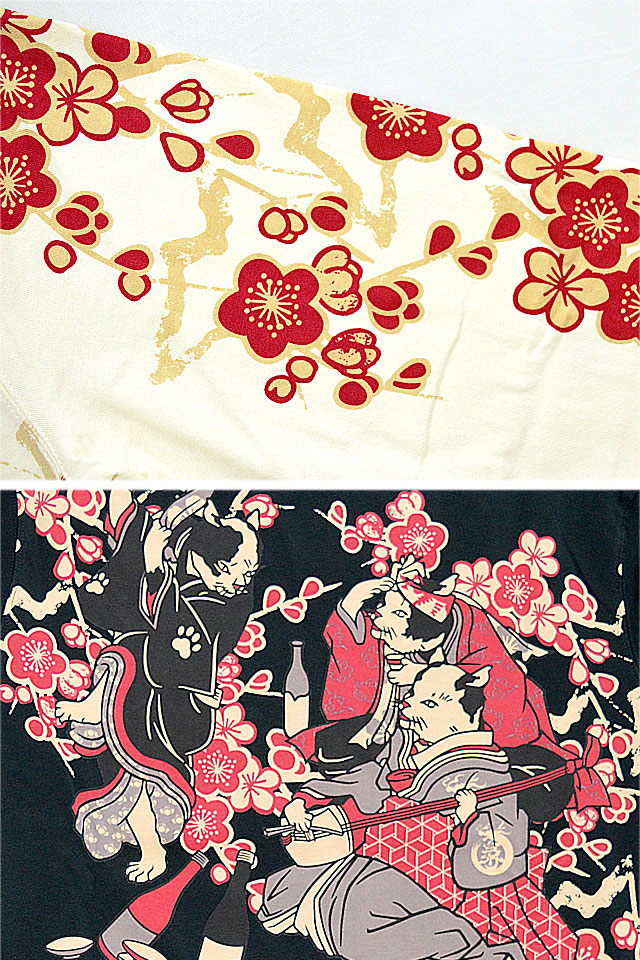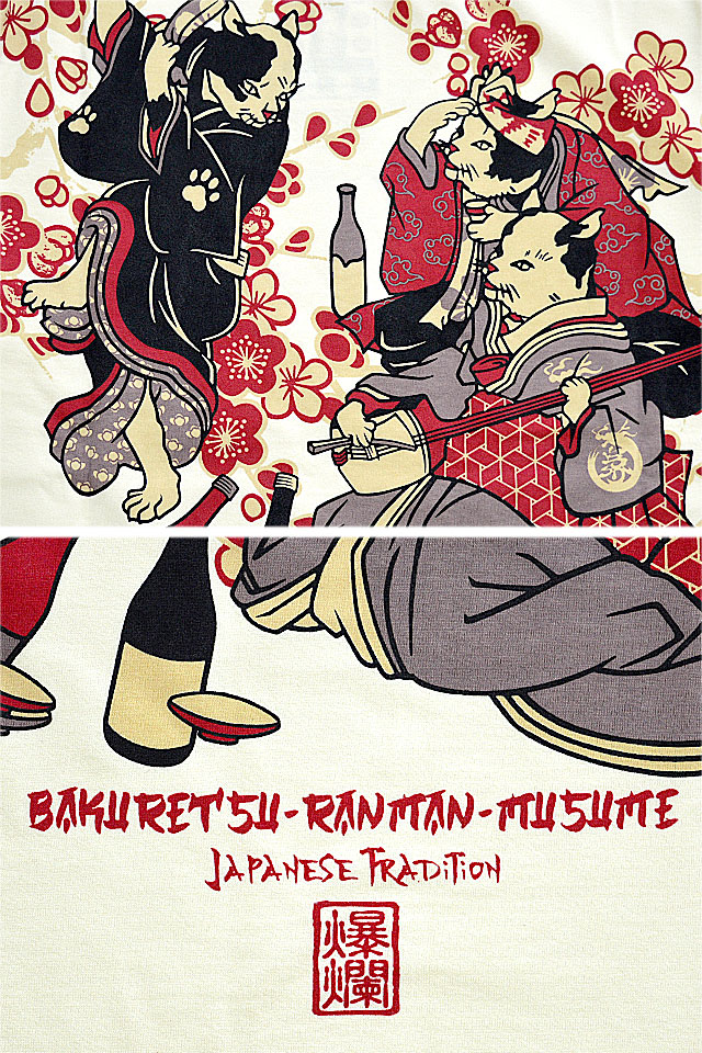 爆烈爛漫娘さんから「流行ねこじゃらしロングTシャツ(RMLT-315)」のご紹介です。 芸者の猫が三味線を弾き、幇間の二匹が踊っているという、某御仁の御座敷です。 バックにしっかり柄を入れている分、フロントはシンプルに仕上げ、メリハリを付けました。 生地には、爆烈爛漫娘お馴染のよれにくくタフなボディーを採用しています。 | ||||||||||||||||||||||||||||||