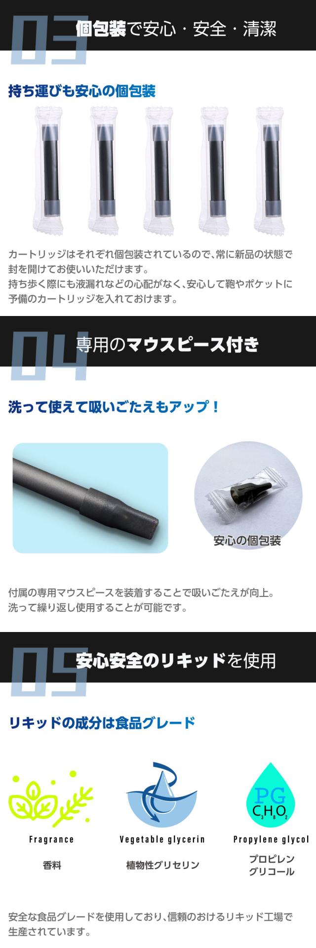 リキッドのメイン成分は天然植物性グリセリン、プロピレングリコール、香料と安全性に最大限配慮しており、当然ながらニコチンやタール等は一切含まれていません。また、本体は耐熱性に優れた食品級の樹脂素材でできており、液漏れを防ぐとともに危険な物質を摂取してしまう心配もありません。